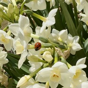 休日出勤のご褒美 足元のスイセンの中で大きくてピカピカのナナホシテントウが元気に動き回っていました 啓蟄期間の最初に出会えたのが幸運を呼び寄せる力が特に強いといわれているナナホシテントウだなんてラッキー🐞