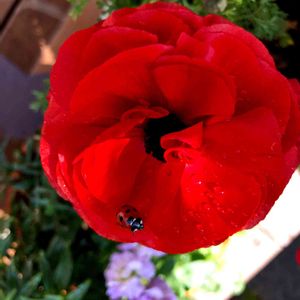 赤いラナンキュラス❤️に赤いてんとう虫🐞が可愛くて元気出ました😊✨✨ てんとう虫🐞何処に行くのかな〜〜😌🍀🍀🍀 ひとときの癒しをありがとう☺️🌸🌸🌸