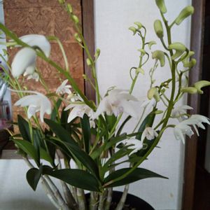 デンドロビウム キンギアナム系 かなり香りの強いラン 現在一本が開花した状態で4個の花が咲いている この鉢全体であと7本ほど開花の準備中