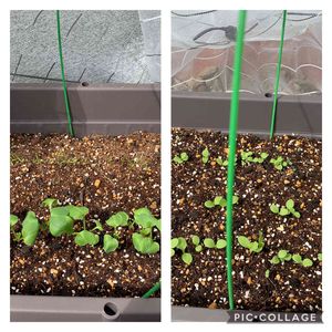 ♫モンシロ蝶々の郵便屋さん が配達ついでに産んでった子に食べられてしまいましたー😭 種まきしたときは不織布で大切にしてましたがお天気続きで布を外しました。 こまめに様子を見たほうがよかったと後悔してます。