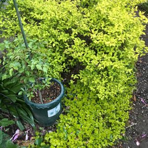 春の色、ライム色のシモツケとリシマキア 春先に植え直したアイスバーグ 寒冷地、鉢植えのバラを上手に育てている方には脱帽です😅
