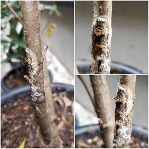 ガマズミ 「カイガラムシ」 「こうやく病」 調子よくなりました。 実は菊鉢7号から6号へサイズダウンしました。 落葉、休眠しているので 根切りをしました。 購入した時にポットから出し 根をほぐさずに鉢に植えたせいか まったく新しい根をはっていませんでした。 苗木が休眠時に、根切した方が 春先に新しい根をたくさん出してくれます😃 今回は、「オルトランDX」と根をはるようにカリ50の「硫酸加里」を土に混ぜました😃