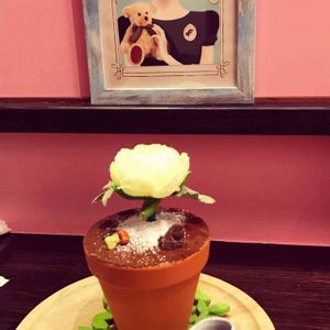 植木鉢ケーキ お花は食べられません 植木鉢も食べられません🤣 スプーンはスコップ🥄 中身は美味しいティラミス😊 花も植木鉢もぜーんぶ食べられるかと思って頼んだけど💦