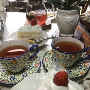 父の日のティータイム☕ 庭に咲いている紫陽花、アカンパス、松明草を飾ってお茶を楽しみました。 ケーキはデパートで買ったものですが、マンゴーのバラ飾りが父への感謝に相応しく華やかさを出してくれました。
