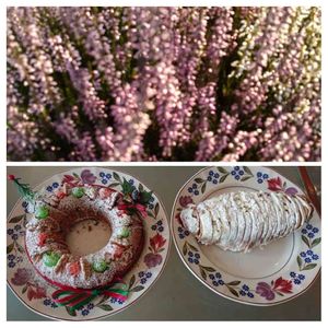 ラム酒のケーキ、焼きました🎵 🍊、plum、🍨~お庭のペパーミント、紅茶と共に~。♪.:*:・'°❣️ 🌹ニチニチソウを添えて どうぞ、お召し上がり下さい~🍰☕🍃