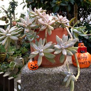 🍀秀麗🍀 門柱の上に置きっぱなしの多肉鉢。 ありふれた秀麗ですが、 丈夫でよく増えるイイ子です。 10月 なので🎃カボチャをお供に📱カシャッ 🏷みんなでハロウィン 🏷もうすぐハロウィン に参加させて下さいね。 あめつぶさんからフーケリーではなく秀麗では?と教えて頂いたので訂正しますね。