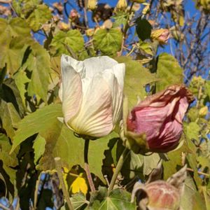 酔芙蓉は普通は午前中に白→午後から薄ピンク→濃いピンク→しぼむ という1日限りのお花。 昨夕、我が家の酔芙蓉はピンクにならず白いまま夜を迎え、なんと朝に濃いピンクのまましぼまずキレイに咲いていた😵 で、今朝開花した白いお花も混じって、いつもと違う光景😆