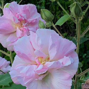 ご近所さんの自家菜園に咲く 🌺スイフヨウ酔芙蓉(アオイ科)ステキな花付きの大木(笑)で〜 昨夕 🌺酔っぱらって、ピンクになった花が まだ綺麗なまま、 今日の🤍白花とコラボして 美を競ってます どっちもきれいよ🤍💓💚