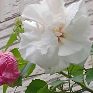 スイフヨウ(酔芙蓉)。 朝に白い花を咲かせ、時間と共に紅くなる様子がまるで酔っているようで酔芙蓉と名付けられたとか。写真は早朝ですので開いている花は白く、萎んだ花びらが紅く色づいています。紅く染まっているところも見たいものです。