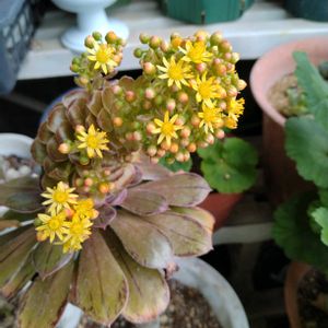 アエオニウム 艶姿・・・ やけに徒長してるな〜と思ったら、やっぱり一花咲かせようとしてました🤭 なのでカット✂️ 後は花瓶で咲かせて下さい♪ 黄色い花が満開になりそぉ🌼 すでに何個もの蕾が顔を出してます🥸 日に日に増えてる〜♡︎ʾʾ