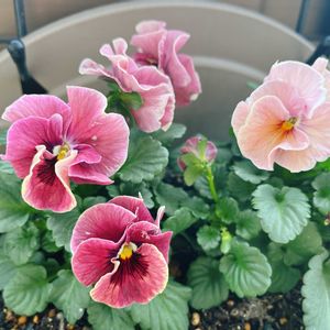 丸顔ビオラちゃん♡ どちらもうえたさんのビオラです✴︎ うえたさんのお花は私好みがたくさんで、いつも迷ってしまうー 手前がビオラ『シャルマンロゼ』 2025年の新品種だそうです。 奥の子は、優しいパステルイエローから目が離せなくて購入。 丸い吊り下げバスケットに寄せ植えしてみました◌⑅⃝*॰ॱ✧˖° みんな元気に、可愛く育ってね!と幸せな気分になります。
