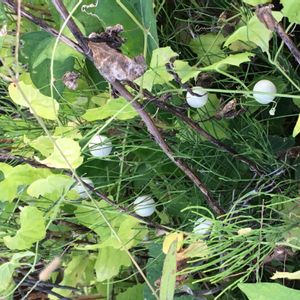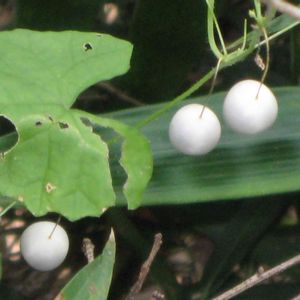 山の谷間に、シャクナゲに絡まってなっていた蔦の実? 樹上では緑色、熟して落ちたものは白い満月の様にキレイです。 スズメウリでした~♪