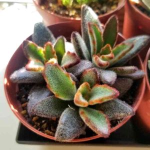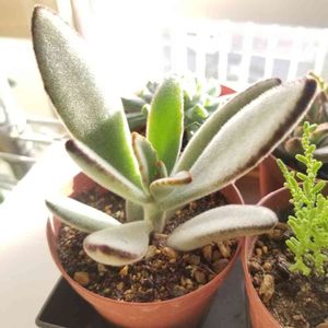 【お陰さまで100picとなりました】 今年の8月10日に始めて、 ほぼ1日1投稿ペースでやってきましたが、 なんとも楽しくGSライフを謳歌できてます。 まだ登場してない子を含め、 いま70種ほどの多肉植物、観葉植物たちに 日々囲まれて暮らしてます。 少しはグリーンハンド(緑の手)になれてるのかな~? はなはだ疑問ですが、 また今日から一歩一歩 精進していきます! あれですよね。 きっとこうかな? やっぱりこうかな? と迷ってもいいんですよね。 枯れちゃった! 蒸れちゃった! ジュレっちゃった! トホホなことがあっても、 それを経験値にまた明日に。 山野草や苔も好きなので節操ないですが、 これからも単なる葉っぱ好きの戯言に お付き合いくださいm(_ _)m そんなわけで、今日のモケモケ君は、 黒兎(くろうさぎ)くんたち。 昨日の黒兎耳(くろとじ)と比べると 茎が短くぎゅっと詰まっていて 葉っぱも少し短め太め。 どちらもカクトロコさんの鉢ですが こうして見ると結構違うわけで。 月兎耳(つきとじ)を中心に生み出された 園芸種のバリエーションの豊かさに 全国モケモケ好きの余りある熱量を感じる 今日この頃。 ○カランコエ 黒兎(くろうさぎ) K. tomentosa f. 'KUROUSAGI' アフリカ・マダガスカル原産の多肉植物。 他のウサギ系多肉の品種よりも黒っぽい緑色をしていて、葉先の模様も濃い黒色をしている。秋になると葉全体の色がより黒っぽくなる。耐寒性5℃。
