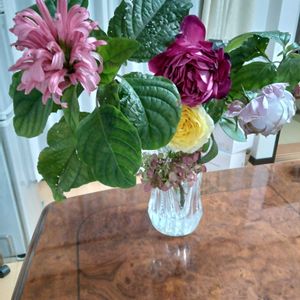 2025.0615(日) 今日のお花のお題が黄色いバラということで 1️⃣娘が不意にいただいてきた花束💐 なんのバラなのでしょうね🤔 ロゼット咲きでキレイです😻 微香です。 2️⃣先日いただいたアジサイと混ぜて活けました。 豪華になりました。 ニャンが倒すので 壁に設置したコーナーシェルフに置いています😹 手持ちの黄色いバラはミニバラさん二つでした🌹🌹 3️⃣花友かずさんにいただいた 黄色いミニバラ 今二番花の蕾がついています。 この子本当に元気だなぁ😃 4️⃣ローズフォーエバーのサンレモ 今春は我が家で一番遅咲きのお寝坊さんでした😴 オレンジから黄色に褪色する感じです。