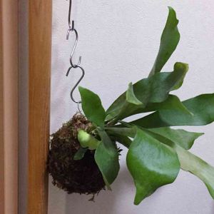 コウモリランの苔玉 出てきました。どんどん新しい芽が〜〜。