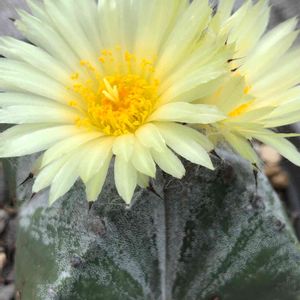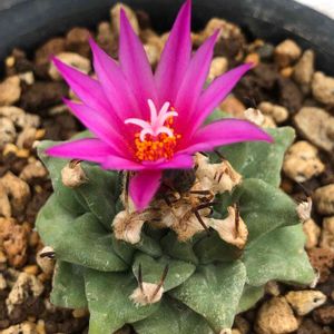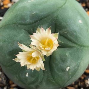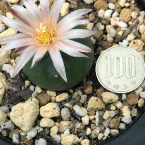 実生のロフォフォラ、生まれて初めての花です。 この花は烏羽玉でしょうか。🧐