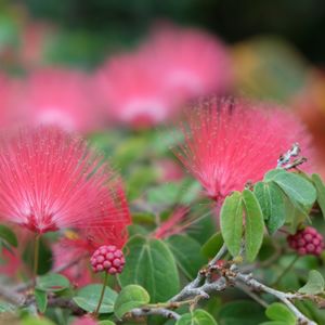 ヒメベニゴウカン(学名: Calliandra emarginata Benth 英名: Miniture Powder-puff、Small Red Powderpuff Shrub 和名: 姫紅合歓)の花🌺🌿🌸 ヒメベニゴウカンは、四季咲きネムノキ(丸葉・高麗ネム)と言い、ネムノキの仲間で熱帯性の四季咲き品種です。 パチパチと揺らめく線香花火のように、夏の季節を輝かせる美しい花です。 素敵な花のゆらめきをお楽しみください。 🌺🌿🌸