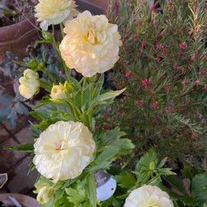 ラナンキュラス ラックスのニノスです😃 今年に入ってから、通販で購入したニノス。 購入時の写真は1.9の投稿にありますが、白の八重咲きで、花心が緑がかっていました✨ 今日見たら👀一瞬黄色買ったっけ??と思うくらいで😅 先進んだらこんな色に変わり、夕日を🌇浴びて花びらが透けてワックスペーパーの様です✨右下の花が咲き始めです。 何より驚いたのが、花心に出てきた赤い色です🟥どうしちゃったの??とじーっと見ちゃいました👀 いろんな驚きを😲見せてくれるラックス🌼毎日、出勤前に外に出して、帰宅したら何よりも先にしまうようにして、大切に育てています☺️