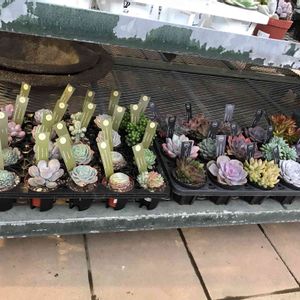 昨日購入したメセンたち。 一番奥は夫がそっと買い物かごに入れてきたものです。 ソテツキリンでいいのしょうか?←教えていただきました。