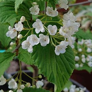オトコヨウゾメ レンプクソウ科ガマズミ属 本州(北陸除く)四、九 岩尾根に多い。少数の花(花径5~7mm)を下向きに咲かす、葉を別ける所が赤黒い、ヨウゾメはガマズミの地方名、ガマズミ程には役に立たないので オトコ がついた。平成28年発芽、やっと咲いた。