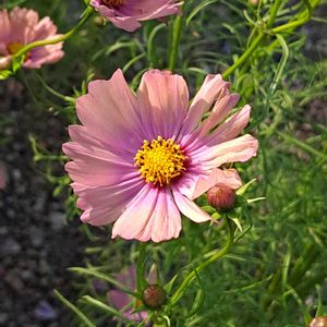 今日の庭から 夏に種を蒔いたコスモスが咲いてくれました。 ミックスの種だったので、どんな子が咲くのか楽しみでしたけど、ピンクのニュアンスカラーのお花が咲いてくれました🙆 まだ、違う色のお花も咲いてくれるかもです。 楽しみ😊 オレンジキャンパスと教えていただきました🙇