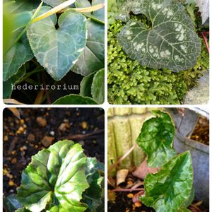 0.6℃🌅/16℃☀ 原種シクラメンの葉っParty🌿♫♪ 1️⃣ヘデリフォリウム 2️⃣インタミナタム 3️⃣コウム 4️⃣↑グラエカム、↓プルプラセンス 5️⃣こぼれ種っこ 色も、形も、模様も、1つとして同じ模様のない葉っぱたちに、この秋はすっかり魅せられています💘 いままであまり注目してなかったのがもったいない! 咲いているお花はあんまりない秋の小庭ですが、楽しみが何倍にも広がった気がします🌿🍂✨