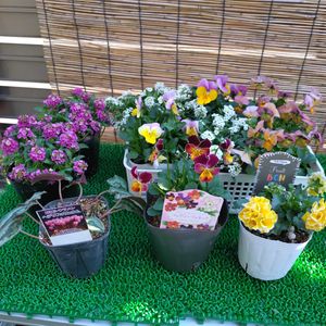 こんにちは☀ 仕入れてきましたー😆 後ろのアリッサム&ビオラは会社花壇用。 1ポット100円✕8ポット。 その他、園芸店さんでお迎えしました。 ◇湘南Berryのパンジー フルーツボンボン🎵 この前お迎えしたシュガーボンボンの仲間です🤭 ◇植田さんのビオラ フェアリーフェネック🎵 花色が気に入りお迎え〜 ◇原種シクラメン ヘデリフォリウム🎵 この前お迎えしたコウムを色々調べてたら知り欲しくなりました😁