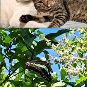 🏷ニャンニャン祭り ❶昨年7月に姉が保護したネコちゃん 凛(白)と寂 リンはキリッとしててしっかり物 ジャクは甘えん坊 ❀チャイナニンジンボク 今年2 回目の開花 🍊パールカン 🦋アオスジアゲハ ❷ショウジョウソウ お隣から昨年一苗頂き今年は沢山増えました。 ➌チャイナニンジンボク セイヨウニンジンボクよりも小ぶりで花色は優しい薄紫色 蕾は白っぽい。 🏷金曜日の蕾たち 🦋アオスジアゲハ ❹➎ムクゲ ローズオブシャロン(青いシォン) 2回目の開花 1回目より花数は少ないですが、花がとても大きいです。 ❹➎同じムクゲです。 📱で撮るとこの花の色が違う色に。 部屋で撮ると本当の色青く写りました。外は明るい過ぎるから? 主にムクゲとアジサイの青色が違って写ります。(¯∇¯٥) 2025 年8月15日 我が家にて ネコちゃんは実家にて撮影です。 ᓚᘏᗢ ↓の🏷「保護ネコ(花生活 ᗢᘏᓗ)」から保護した頃のリン ジャクを見れます。 よろしくお願いします(⋆ᵕᴗᵕ⋆)❤︎