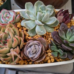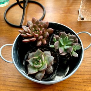 中央2個はフジビジンと 上方がシノクラッスラで 下方は朧月を置き 周りは同僚から頂いた 多肉ちゃんを寄せ植えしてみました 一つ一つ鉢で育てるより 寄せ植えがしたくて まとめてみました╰(*´︶`*)╯♡