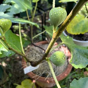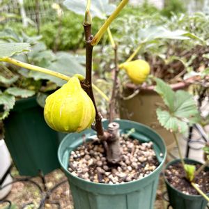鉢植えイチジクコレクション。 初めて鉢植えゼブラスイートが実った。 どれも収穫はまだまだ先。