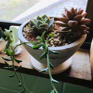 寄せ植えパート2 白牡丹の再生中の茎から芽が出てきた子をカクトロコ産の1号鉢の子たちと寄せ植え😊元々あった葉っぱが取れちゃって、寂しそうだったので、賑やかになった✨ 隙間は、知らないうちに増えてる金のなる木の若い子を🌱 パンプキン型の鉢もカクトロコ🌵でゲット✨