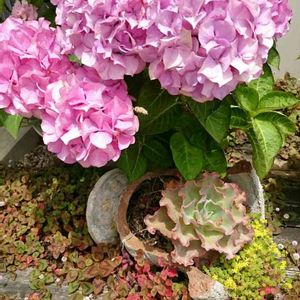 昼休みにデパートの屋上を多肉散歩。 ⬆最近の定番✨ ピンクの紫陽花とシャビアナの組み合わせが綺麗~! 家の屋上でも再現してみた~い✨…って思うんだけど、多分無理…吹きさらしで紫陽花が上手く育たないのよね。。