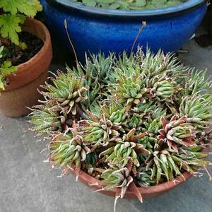 取り敢えず空いていた駄温鉢に収容(´ω`) ちょっと狭いけどその内に。 親株の下でギュウギュウだったので株が斜め…💦↖↖↖↖ 強風に吹かれているみたい。。