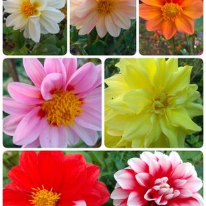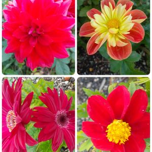 我が家で咲いているダリヤです💕 黄色と、下の赤は芋から育てました。他のは種子からで、なえを近所の人からもらいました。下の赤は、同じ芋からです。 来年様に、いもを掘って保管しますね😃💕