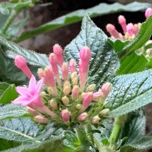 💜ブルーペンタス・シリウス(アカネ科) 薄紫の美しい花が雨粒で、いっそうオシャレに💠💠💠🌿 🏷️ 今日のお花(昨年9月のpic)冬越ししたけど、まだ蕾で〜 元気がなく、咲くか微妙💙