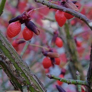 先日紅葉を見に出かけた公園でニシキギの実を見ました。紅葉している赤い葉ばかりでなくまだ緑色の葉の枝にも赤い実がついていました。(22/11/17撮影)赤い実 ⑧
