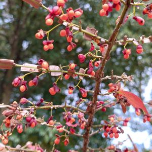 山で見たニシキギ(錦木)…だと思います😅 赤い実と翼と呼ばれる硬いコルク状の枝が特徴ですね😊 私はカミソリの木という名前で覚えていました。 枝が昔のカミソリの形に似ていますね🤗 錦木という名前も素敵ですね。 もう少しすると葉っぱが綺麗に色づくようで、それが名前の由来だそうです🍁🍂 そんな姿もまたぜひ見てみたいですね🍁
