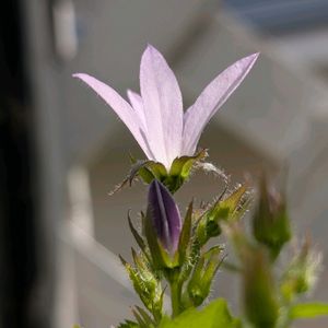 カンパニュラやっと咲きました 昨年購入して植える場所を迷ってポットのまま花壇に埋めて越冬 今年はとりあえずハンギングバスケットに入れて置きます🤭 最初の一輪は嬉しいです✨