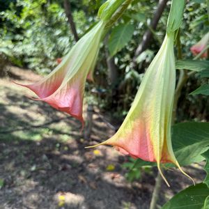 🟡キダチチョウセンアサガオ 下向きに垂れ下がった鮮やかな花が特徴です。 エンジェルストランペットともいい、美しいラッパ状の花が印象的です。ただ毒草なので扱いには気をつけてください。 ⚫︎ナス科 キダチチョウセンアサガオ属 ⚫︎原産 中南米 ⚫︎花期 6月〜9月