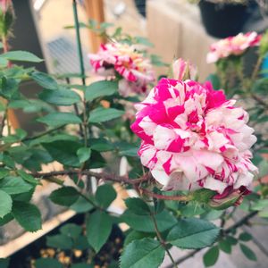 ミニバラ🌹ストレンジミュージック ミニバラだけど切り接ぎ苗。 おかげでこちらも株元からベイサルさん🐒 葉っぱが小さくて混み合うから しょっちゅう黒点祭りだけど💦 赤白の絞りのお花をたくさんつけてくれます。 絞りの花に弱いなぁ、私😅
