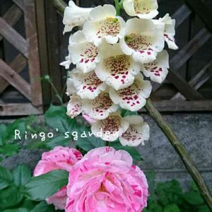 ジキタリス & 🌹センチメンタル 去年、地植えにしたセンチメンタルの上に あごをのせるかのように咲きました(笑)