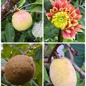 まん丸の実と半開きのダリアです😁 ↖️アルプス乙女(姫林檎)、ほんのり色づいて来てます🍎 ↙️トチの実(マロニエ) ↘️アーモンドの実、今までより一段と大きいです😄