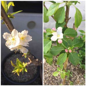 クラブアップル(右 アルプス乙女(左 まだ去年植えたばかりなのでちっさい木ですがちゃんと花咲くんですね。 つんだほうがよいのかしら