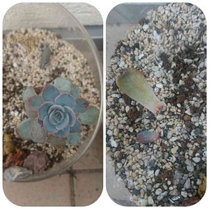 おはようございます☔今日も雨ですね😵そんなジトジトなのに頑張ってくれてました😆多肉植物の葉っぱをみなさんのを見様見真似でおいてみたら✨見にくいですが小さな芽が出てきたと思います😆やった~🙆