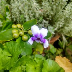 パンダスミレもまた顔を出してくれました 後ろにはクリスマスホーリーの実がなってます 秋に向けて赤くなっていきます 鳥さんに食べられなければ、また紹介します