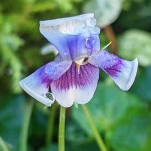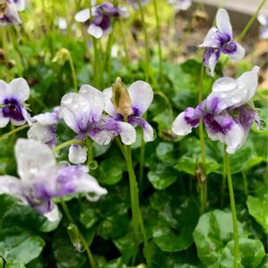 今日2枚目は雨上がりの パンダスミレ🌿🤍💜🤍🌿 朝陽に雫がキラキラ✨💧✨ 🏷水滴の水曜日 🏷水曜日は水色 そして菫色🌿💠🌿 今日も宜しくお願いします🌿💠🌿 今朝の散歩で🌄