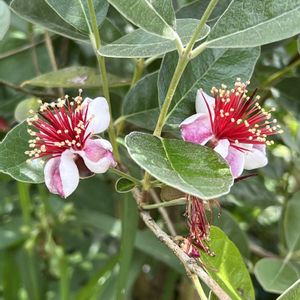 フィジョア(フェイジョア)の花が咲きました。今年は植えた2本の木に花が咲いたので、人工授粉しました。実りますように。
