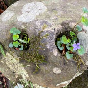 庭石に穴が二つ、そこにすみれの花が咲きました 昔雨垂れであいた目のような穴が、顔みたいでした‼️ 自然は不思議で、芸術家です👩🎨