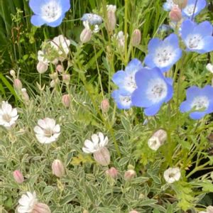 ネモフィラとシレネ ユニフローラ仲良く咲いてます シレネさんは、昨年からの冬越し株、広がってます‼️ 可愛い花がたくさん咲いてきて、毎日覗き込んでます 面白い形の花ですね🤍♡