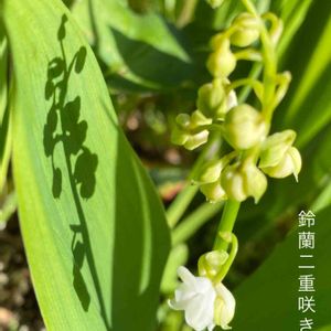 鈴蘭 二重咲きです🤍 我が家の花畑の朝日があたる所で 今年は3株花を咲かせています♡🤍♡ 葉に影絵のように姿が投影されてます‼️